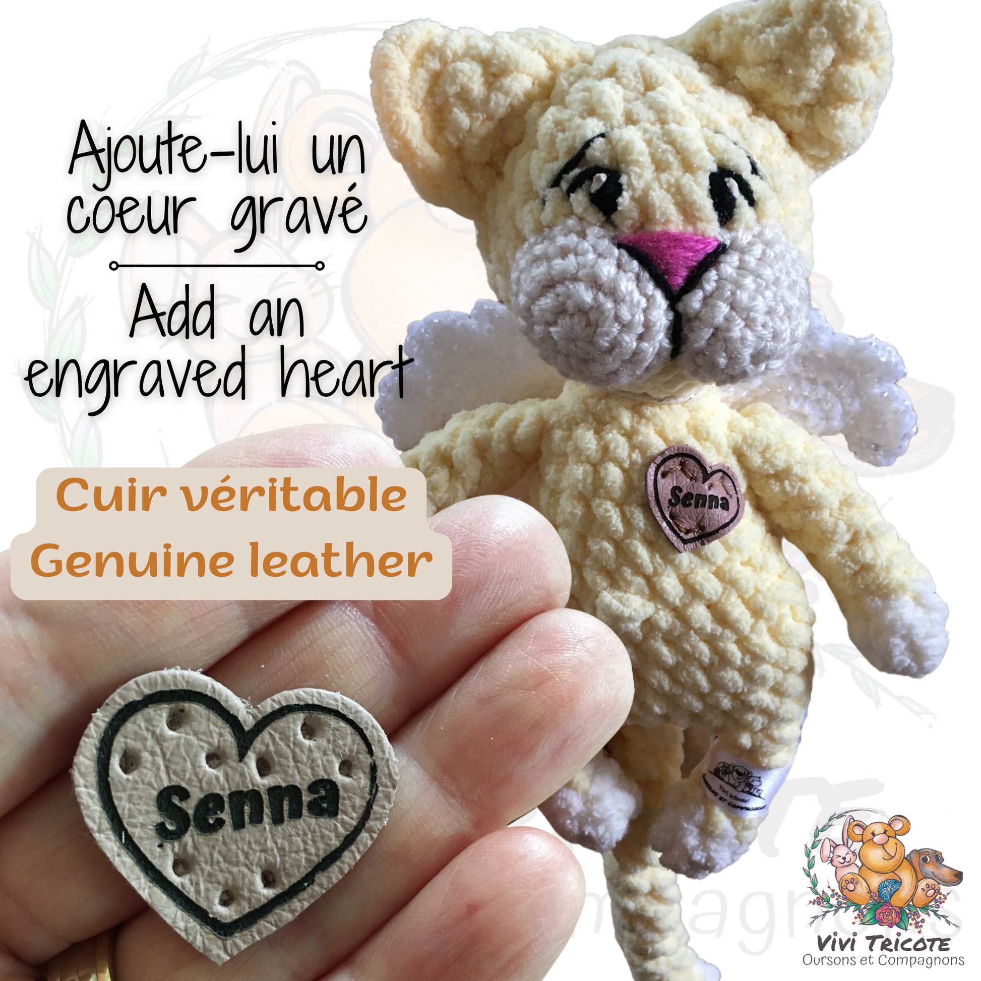 Ce nouveau texte sera gravé au laser sur une petit pièce de cuir. La gravure au laser n’offre pas la possibilité de colorier le texte, seul le cuir offre un choix de couleurs.